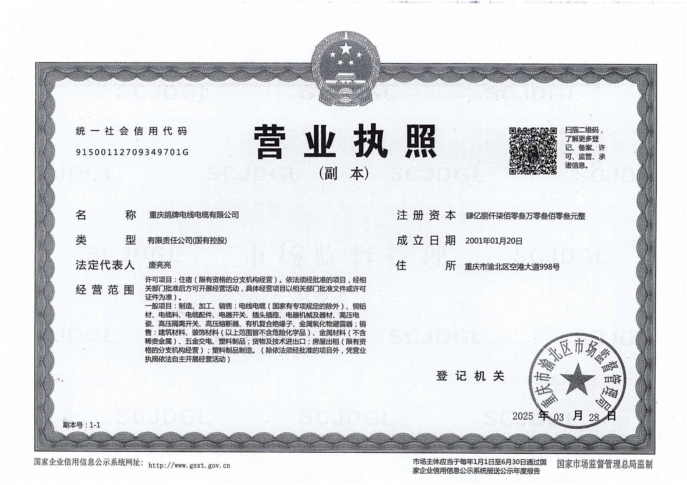 公司下設線纜廠、銅材廠兩個生產廠,并設有重慶鴿牌電瓷有限公司、重慶鴿牌電工材料有限公司兩家子公司。公司已成為中國西部家裝電線、特種電纜、銅型材、高壓電瓷產品的主要生產基地。